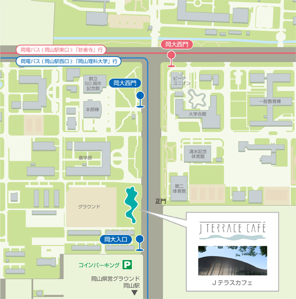 岡山大学の正門入ってすぐの場所にJテラスカフェはあります。